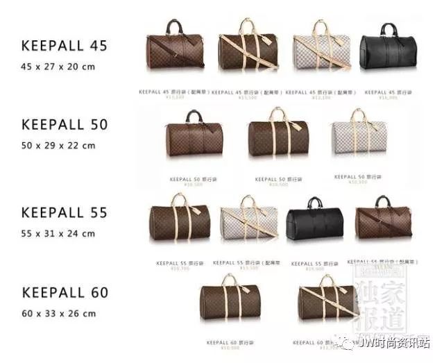 言归正传,我们来介绍这款包吧 关于LV Keepall的尺寸 LV Keepall一共有4个尺寸,分别是: 45cm:W45×H27×D20(cm) 50cm:W50×H29×D22(cm) 55cm:W55×H31×D24(cm) 60cm:W60×H33×D26(cm)