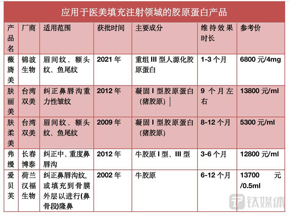 重组胶原蛋白分类,来源于国家药品监督管理局 基于重组胶原蛋白的优势,该赛道的增势颇为强劲。公开数据显示,2022 年我国重组胶原蛋白市场规模为 185 亿元,占胶原蛋白市场规模的 46.6%,同比增长 71.3%;2017-2022 年的年均复合增长率为 65.3%,预计到 2027 年,我国重组胶原蛋白市场规模将达到 1083 亿元,占胶原蛋白市场规模的 62.3%,预计重组胶原蛋白市场 2022-2027 年复合增速有望超过 40%。 对比来看,据弗若斯特沙利文统计,2017-2021 年中国重组胶原蛋白应用于专业皮肤护理的零售额复合增速为 67.5%,超过动物源胶原蛋白(32.4%)、透明质酸(44.4%)和植物活性成分 (17.6%),是增速最快的皮肤护理材料。 细分来看,胶原蛋白分为 I 型、II 型、III 型、IV 型等,其中重组 III 型胶原蛋白成为各大厂商重点布局的领域。 一位行业人士对钛媒体 APP 表示,III 型胶原蛋白介于表皮层与真皮层之间,是撑起皮肤的关键,正常婴儿皮肤 III 型胶原占比 80%,随着生长发育,III 型胶原蛋白持续快速流失,I 型不断增加,成人皮肤中的 III 型胶原蛋白仅占 20%。因此,III 型胶原蛋白也被称作 " 婴儿胶原蛋白 ",是目前抗衰领域中的关键性生物材料。 企业端来看,台湾双美、荷兰爱贝芙等系动物源胶原蛋白的代表,而华熙生物、锦波生物、巨子生物以及创健医疗等皆在重组胶原蛋白领域布局。 胶原蛋白下游应用领域:医美注射填充被寄予厚望 " 我最期待的就是胶原蛋白在医美注射填充领域的应用市场,个人认为该领域的前景、市场空间较好。" 一位正在布局 III 胶原蛋白的行业人士表示。 重组胶原蛋白在医美注射填充领域被寄予厚望,背后的市场逻辑主要在于三方面:一是轻医美市场近年来增势强劲,二是胶原蛋白在注射填充赛道中的渗透率较低,三是该领域的既有产品增长迅速。 以锦波生物旗下核心品牌薇旖美为例,该产品从 2021 年 9 月开始销售,2021 年、2022 年的营收分别为 0.28 亿元、1.17 亿元,占总营收的比例分别为 12%、30%;2022 年薇旖美销量达到 16.38 万瓶,同比暴增 653%。 钛媒体 APP 了解到,胶原蛋白产品在医美注射填充方面的应用主要集中于 " 眼周抗衰 ",该领域的胶原蛋白产品主要包括薇旖美、台湾双美的肤丽美(凝固 I 型胶原蛋白)、长春博泰的弗曼(牛胶原 I 型、III 型)等。目前获批的可用于注射填充领域的胶原蛋白产品不多,整体而言,该领域主要还是以玻尿酸为主,胶原蛋白渗透率相对较低。