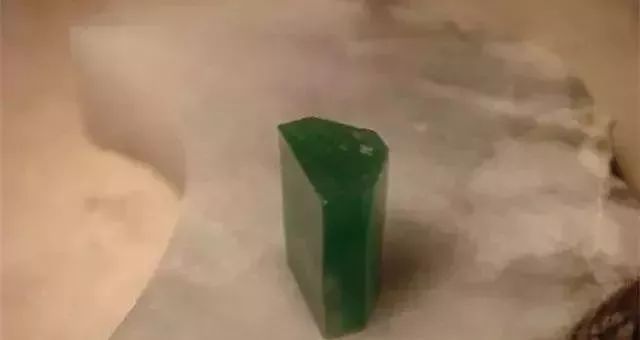 在打光灯下看抠下的好料,通透底子很干净,绿的有些辣眼。切的过程中,片料被分成了大大小小,打型、磨边,料子越切越小,戒面越磨越多,有种有色,非常不错。